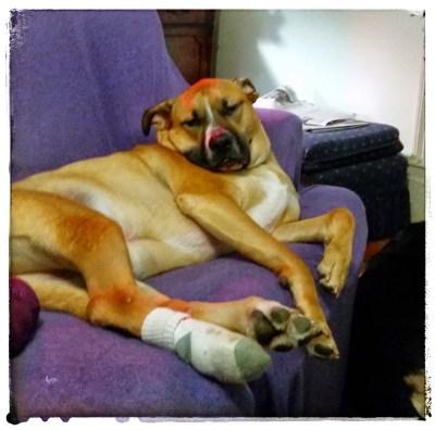 Brutus is sporting his favorite accessory. To keep him from licking his slow healing lick granuloma, Brutus sports a sock every day and gets a foot wrap at night. 3 weeks later, we are still not fully healed, but getting closer every day. As you can see he is taking it all in stride. Oh what fun allergies are!