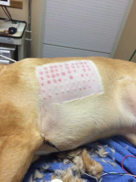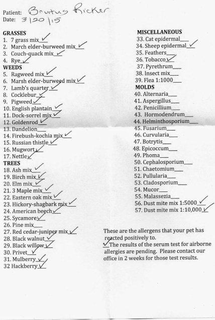 Brutus had his allergy testing done today. As you can see by the photograph below, his skin was very reactive to many of the things tested for. Now we wait about 2 more weeks for the blood serum test to come back so the vet can make the allergy shot cocktail. Below is also a photo listing the results of the skin test. I’ll let you know as soon as we get final results in a few weeks.
