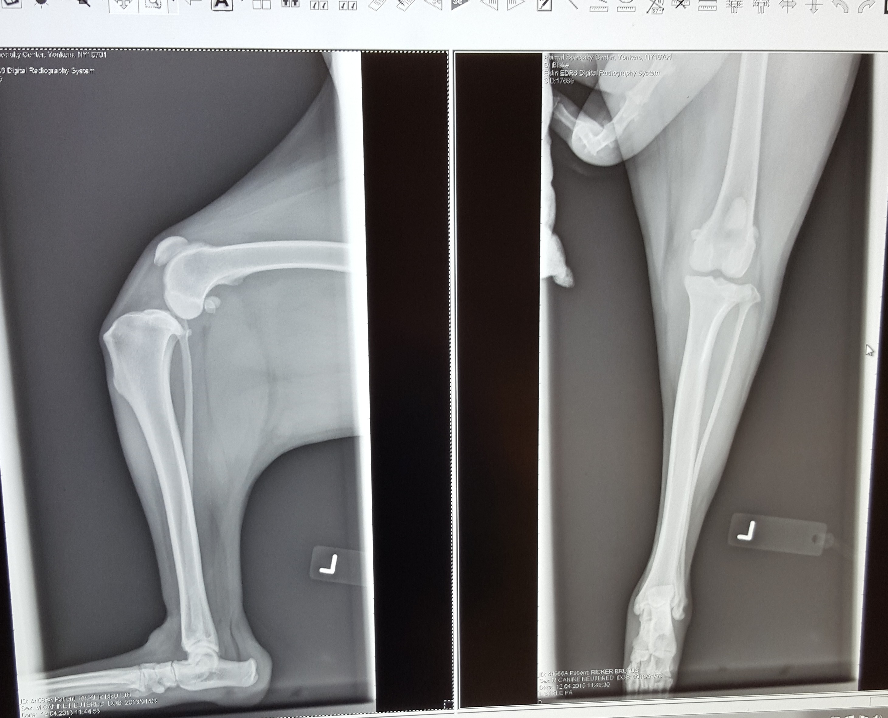 Here are pictures of Brutus’ knee showing before and after surgery. Pictures are taken just before surgery and then after the plate is in place, to compare and ensure proper placement before finishing up. The plate will be there for the rest of his life.