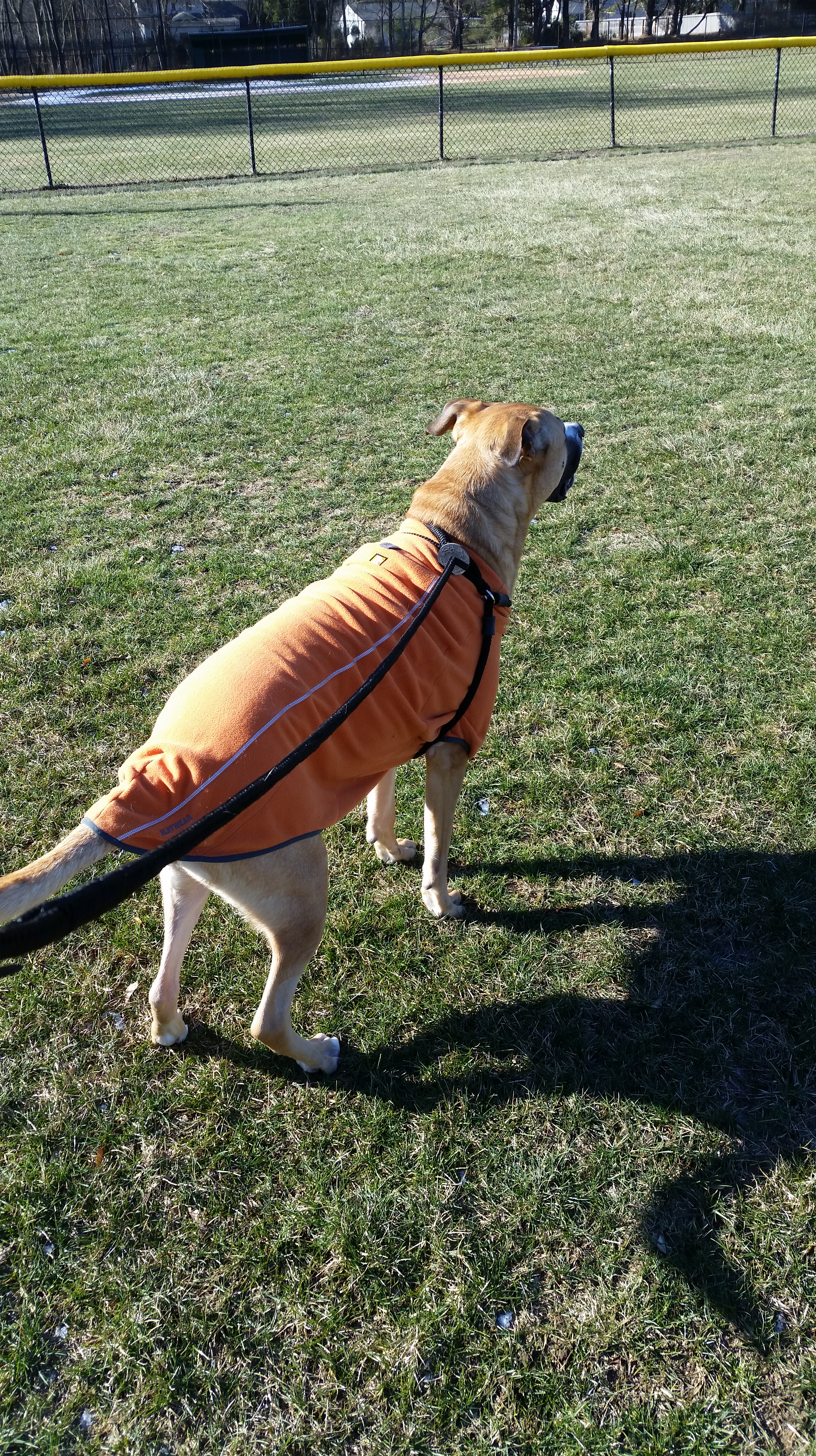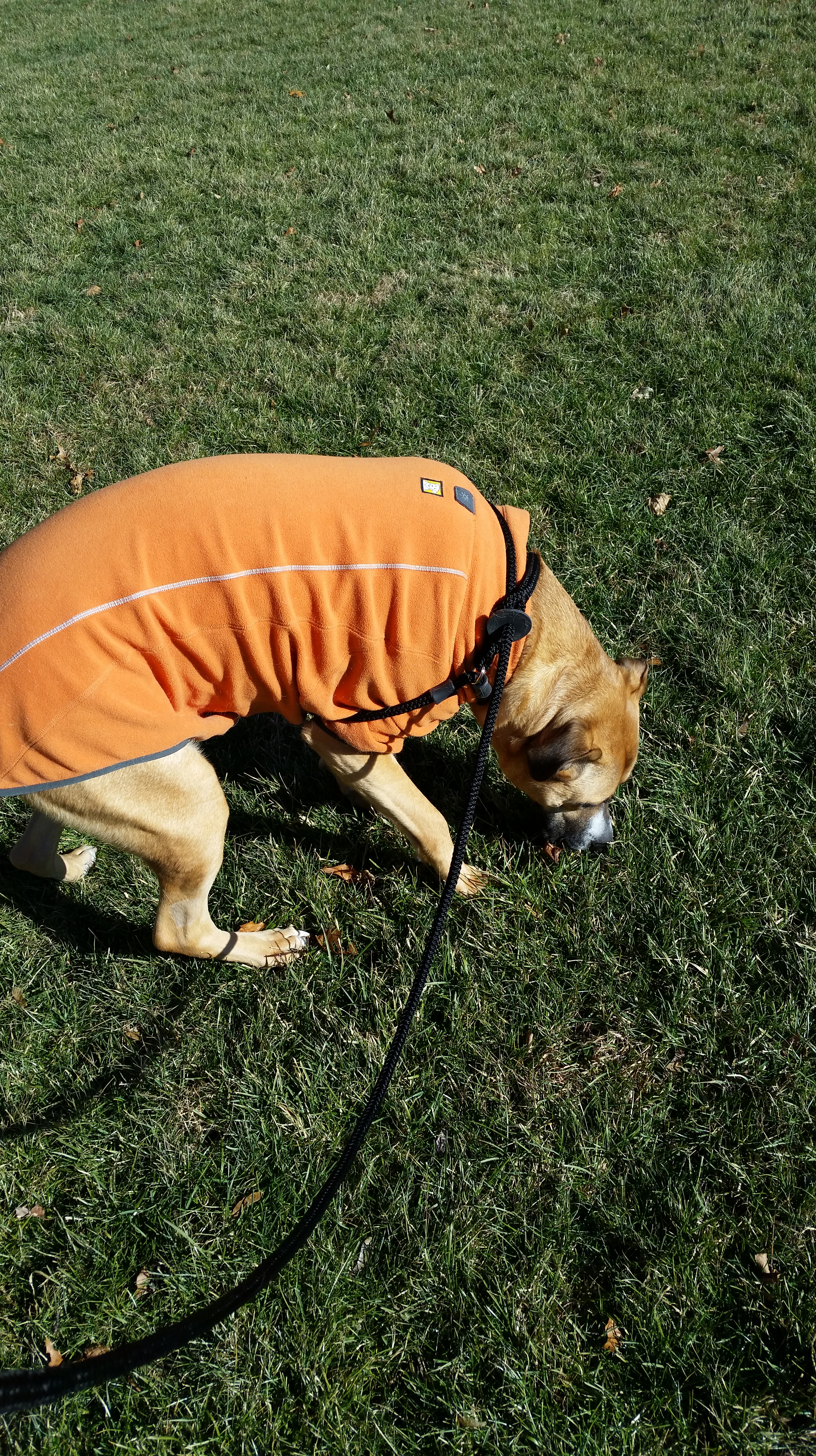 I broke out his fleece jacket today. Now that he is walking longer, it’s a bit nippy. With all the weight he has lost, the coat is now super long, but it still does the job.