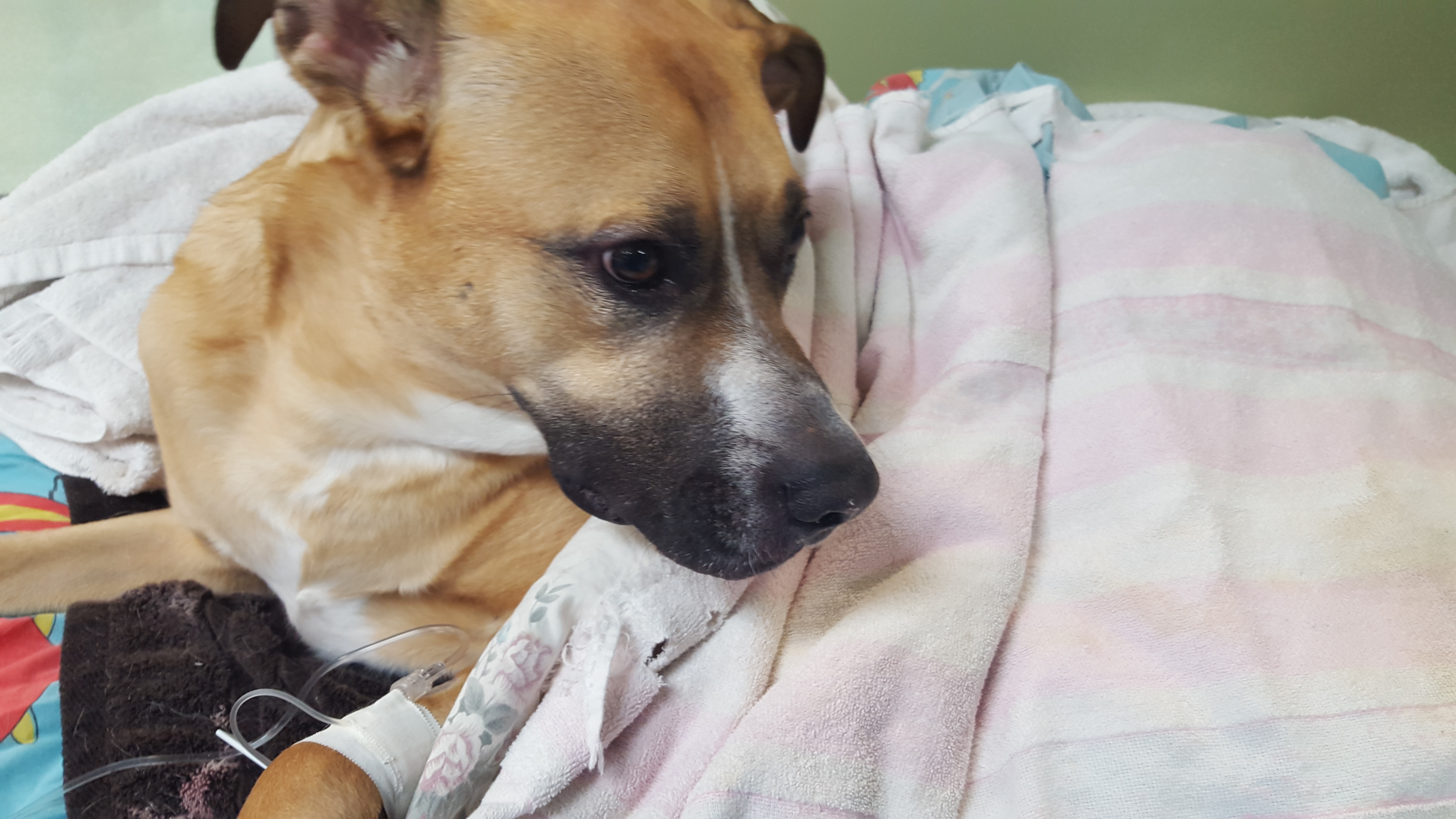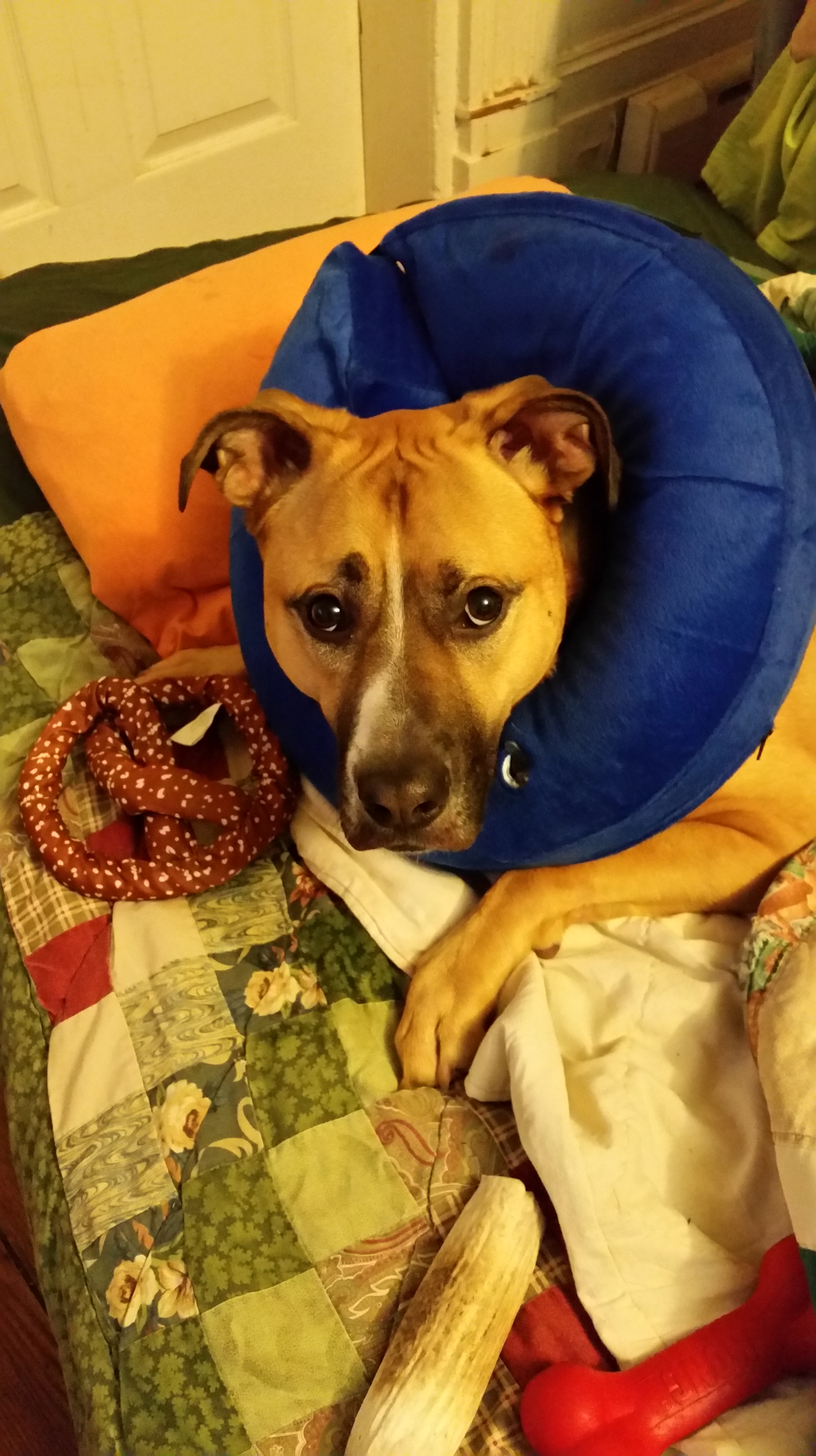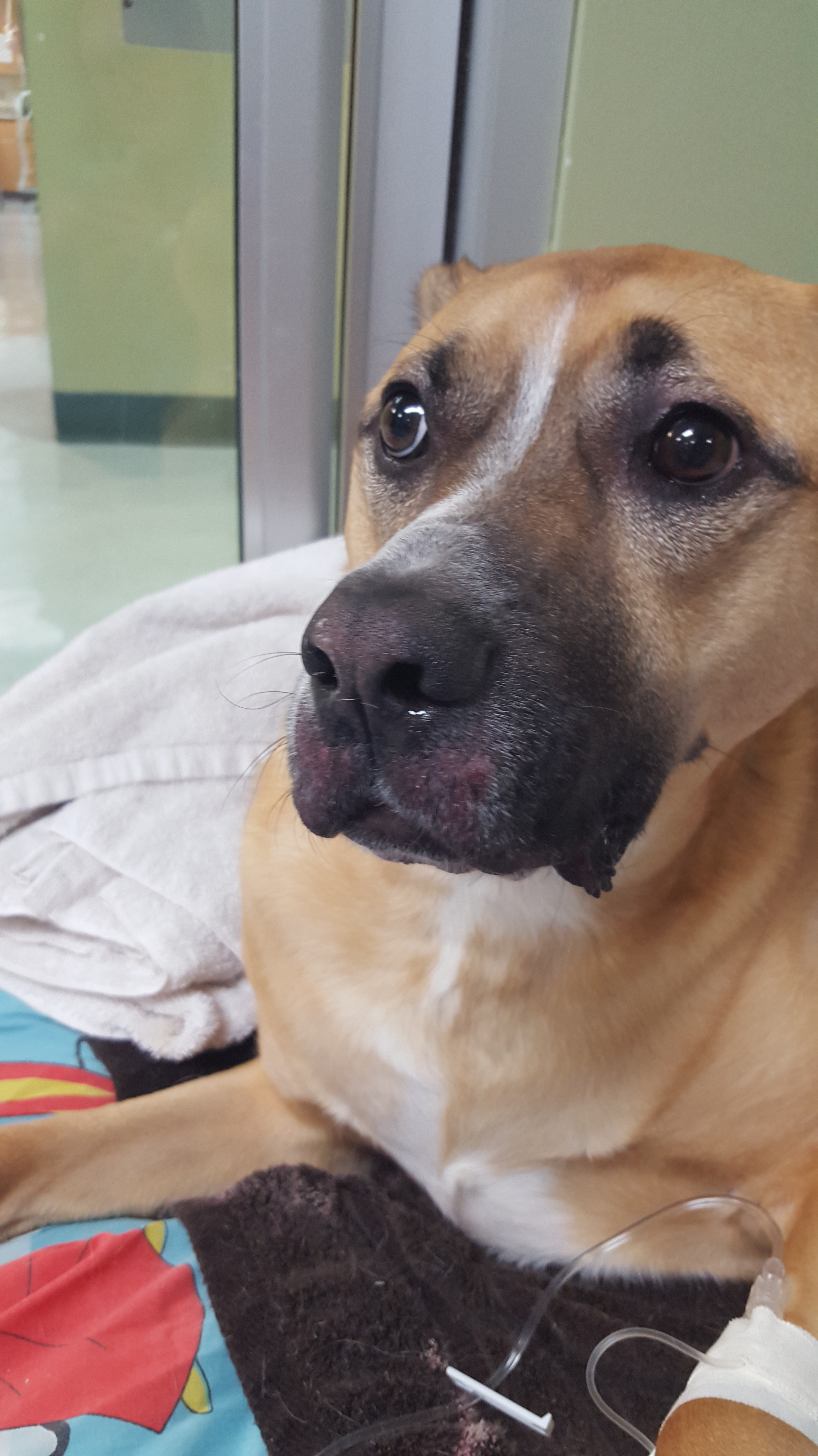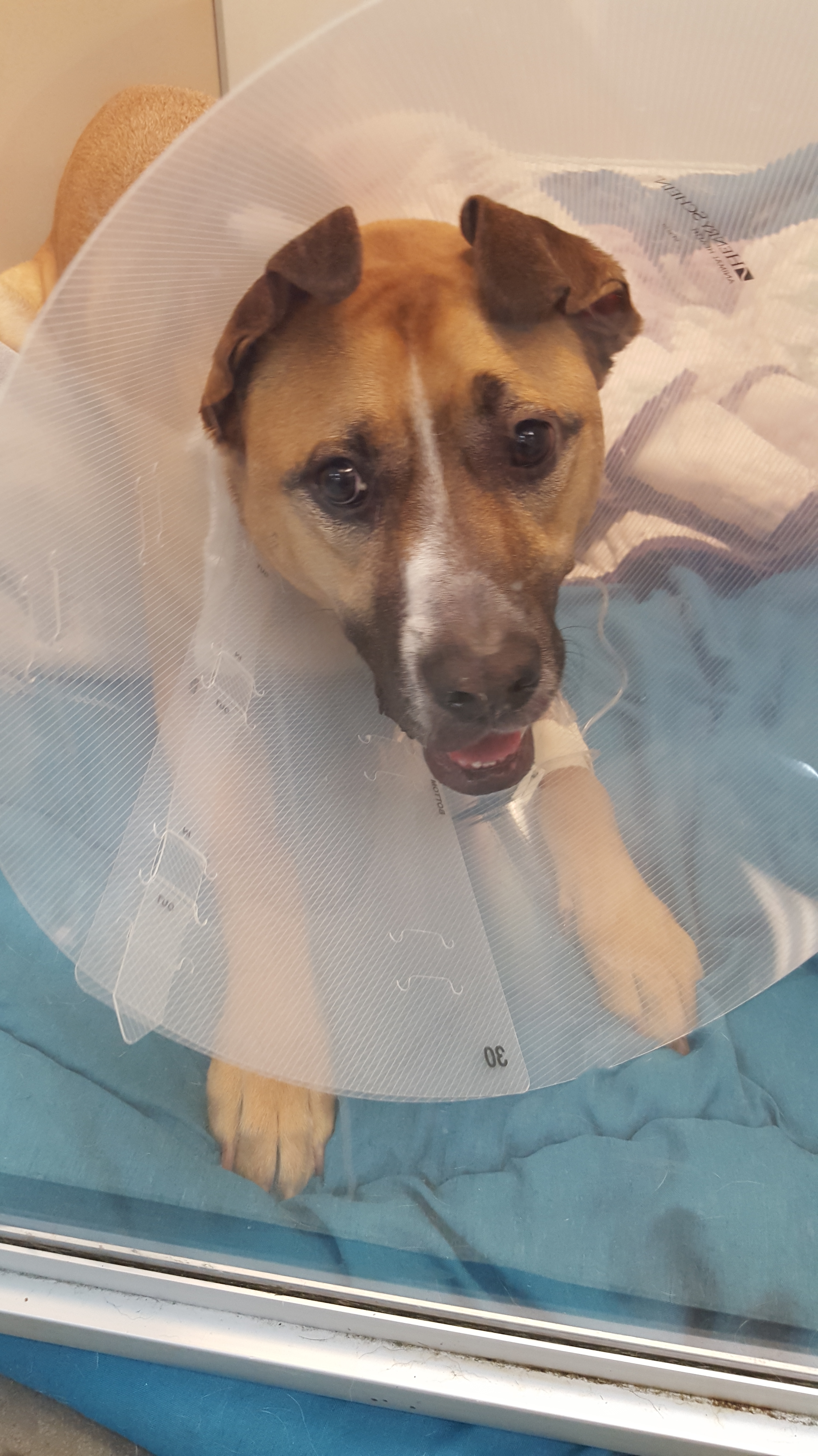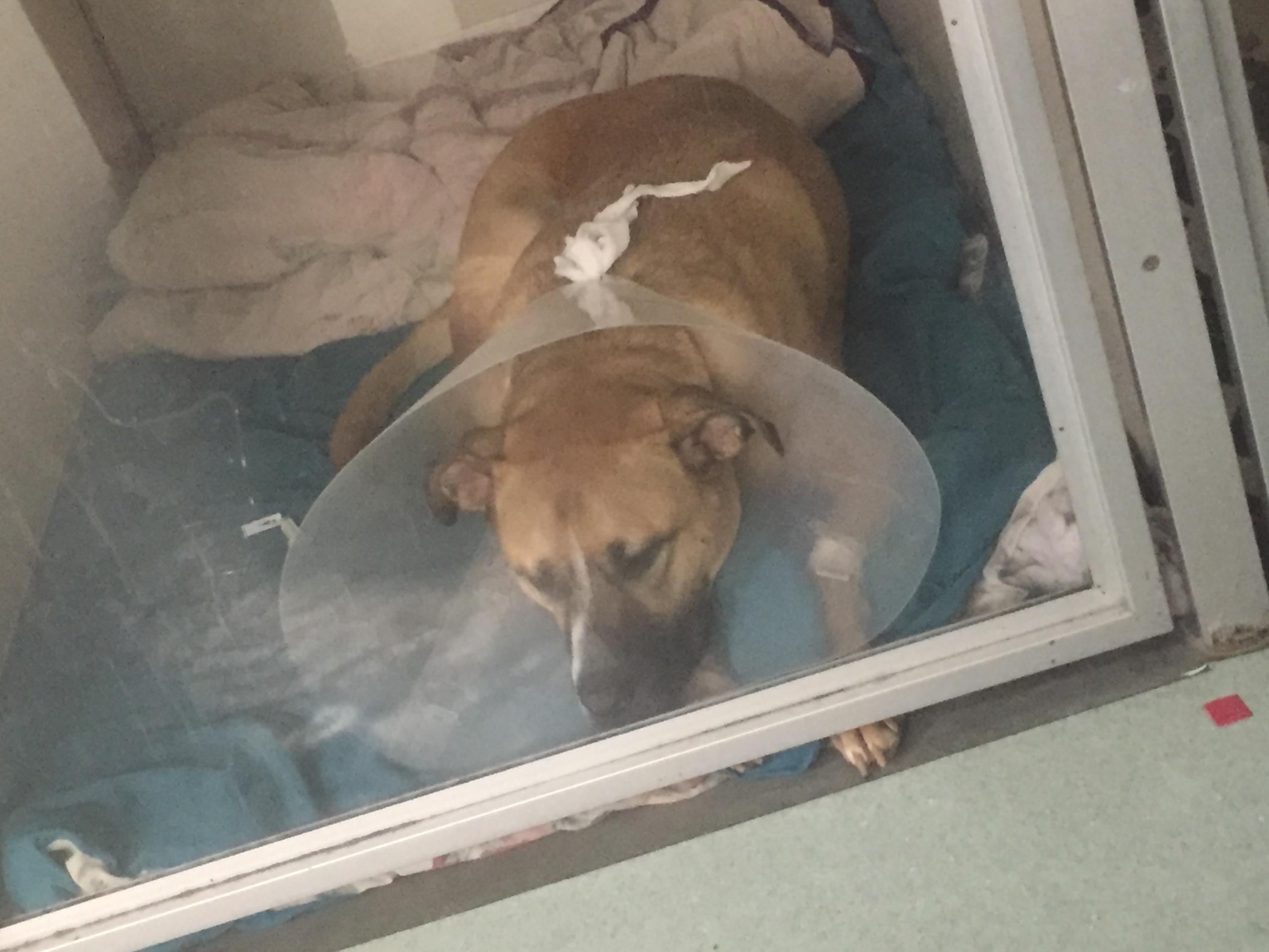 Dropped Brutus off this morning for surgery. Everything went smoothly and he did great. Here is a picture of him in is recovery suite. Nicely high on some wonderful pain meds, he will sleep well tonight and come home tomorrow.