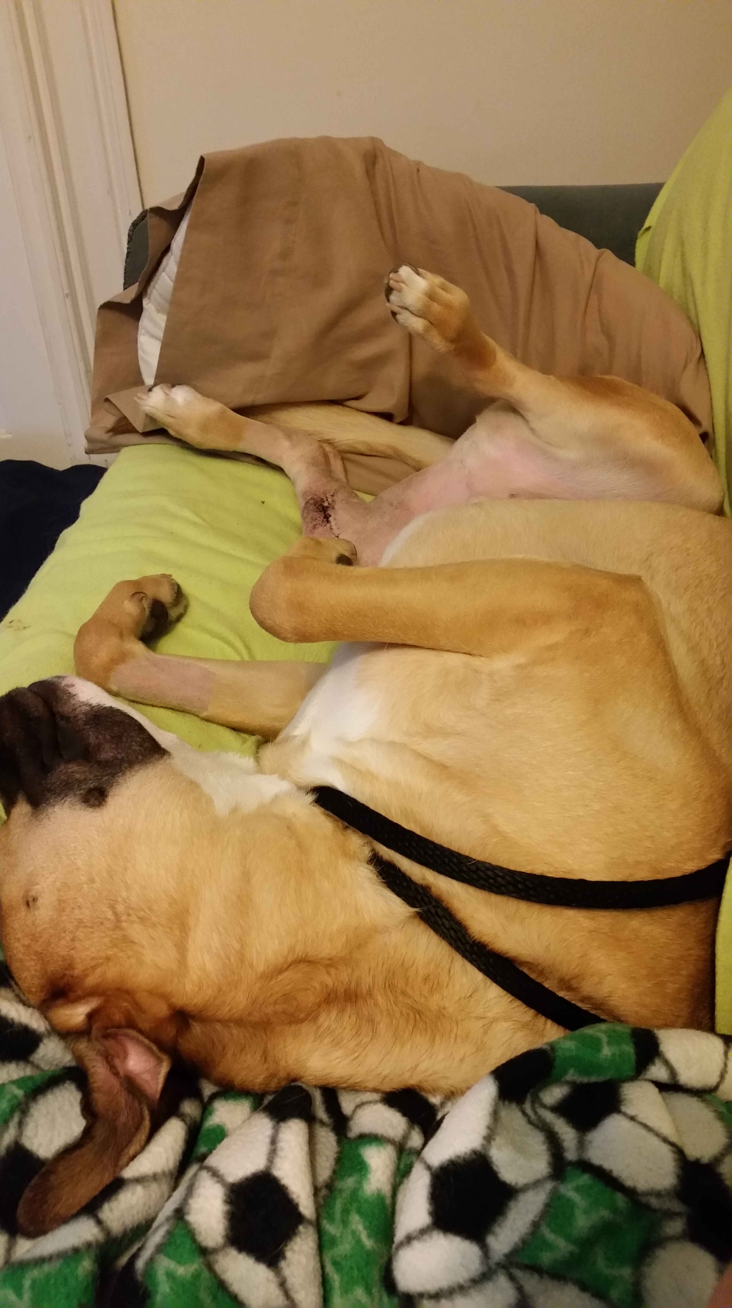 Things are going really well so far. Brutus is using the leg and his incision is healing nicely. We head to his regular vet tomorrow to get is staples removed. Yesterday, we went to his physical therapy consultation. Accept for Brutus’s dislike for restraint, it wasn’t too bad. We are going to have to work on him laying down on his side for a massage and for the range of motion exercises. I have a week to see if I can improve this before his next appointment. Judging from the picture below of how he spends his days, you would think it would be a simple thing to get him to do but no he enters a complete and utter panic. I think we can improve this with some green beans and other goodies. Wish me luck. lol We do get to walk each day for a whole 5 minutes increasing to 10 minutes over time. This is so exciting and should help with his feeling of being couped up.